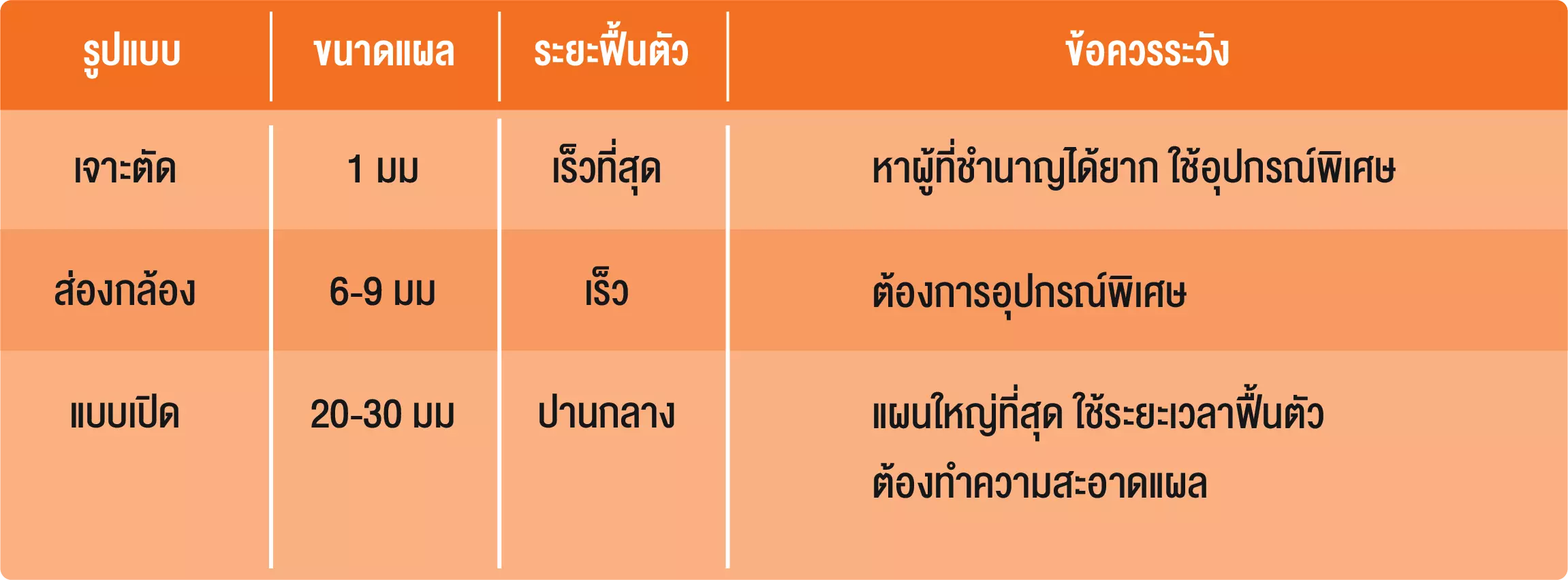 นอกเหนือไปกว่านั้น วิธีนี้จะไม่ทำลายกล้ามเนื้อ เนื้อเยื้อ และเอ็นโดยรอบ รวมถึงเส้นประสาทที่อยู่ใกล้เคียง ซึ่งจะไม่เหมือนกับการเปิดผ่าเเบบเปิด และจะเป็นการผ่าตัดเเบบล่างขึ้นบน
