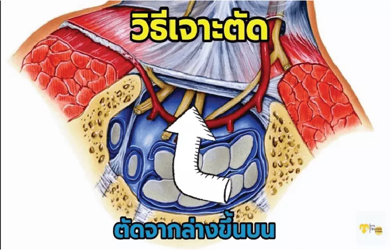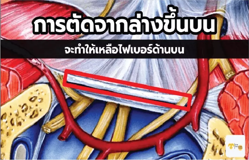 ซึ่งการตัด แบบล่างขึ้นบน ตามรูป สามารถทำได้โดยการใช้เครื่องมือเเบบพิเศษ พร้อมกับด้วยการนำทางของเครื่องอัลตราซาวด์ จะทำให้สามารถตัดเฉพาะพังผืดด้านล่าง ที่กดทับเส้นประสาท โดยที่เราไม่ต้องตัดตัดไฟเบอร์ด้านบน